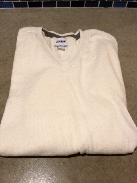 (After being forced to clean out his closet) Mike throws this sweater and says, “Do we have a Goodwill bag started?” No. “Well, I’d like to give this to someone who can use it.”